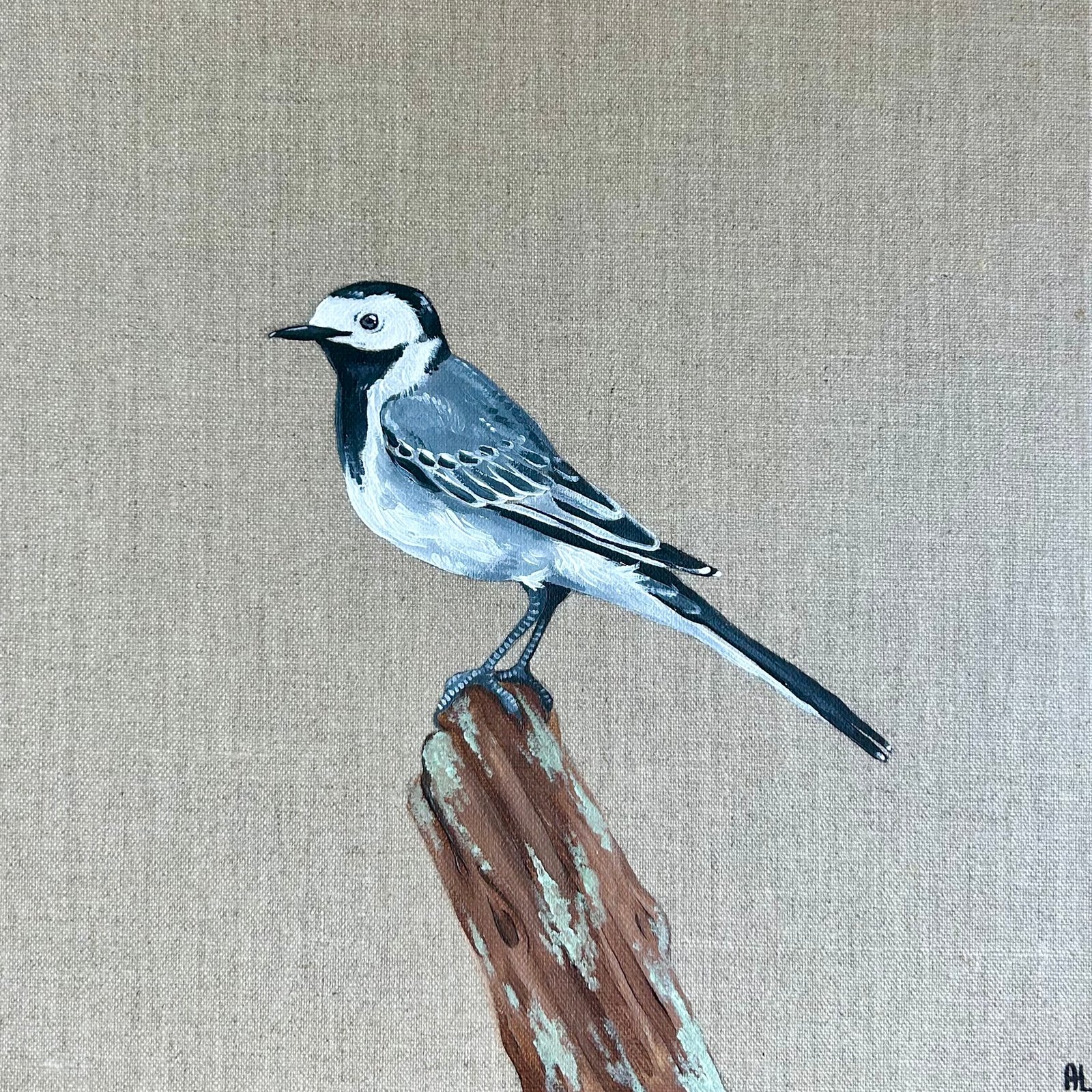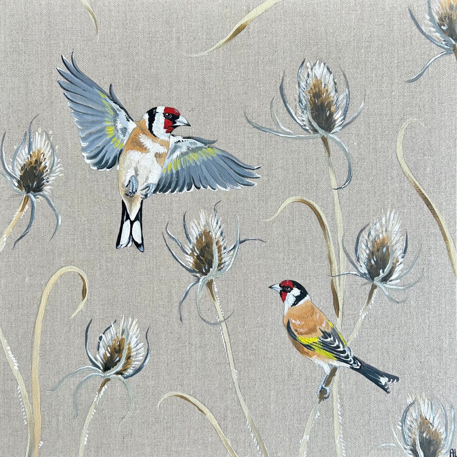 Je réalise la plupart de mes créations sur des toiles en lin tendues sur châssis et des cartons toilés en lin, dans un souci de cohérence entre le support et les sujets que je représente.